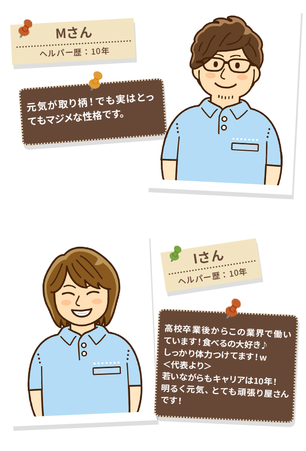 障害の種類や症状の程度によって必要とする介護は異なりますが、経験はもちろんのこと、常に利用者様の立場に立った行動と姿勢で最大限のサービスを提供させていただきます。
